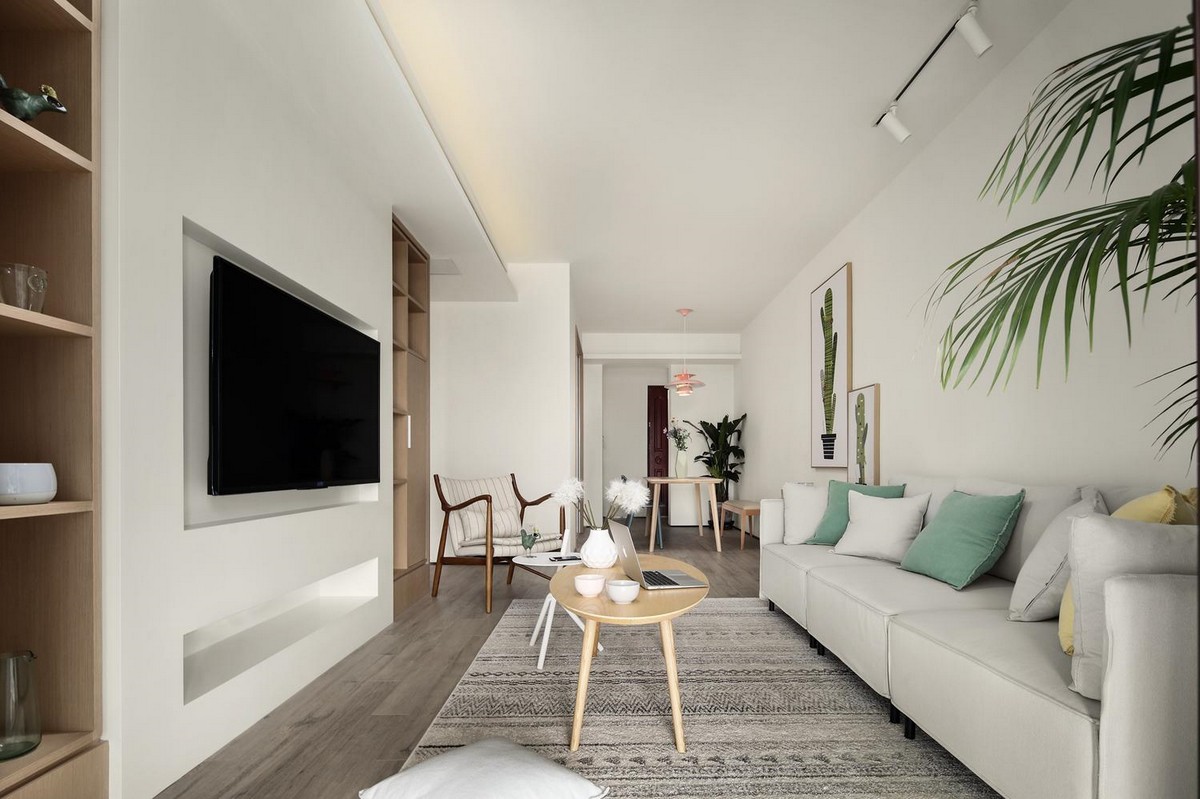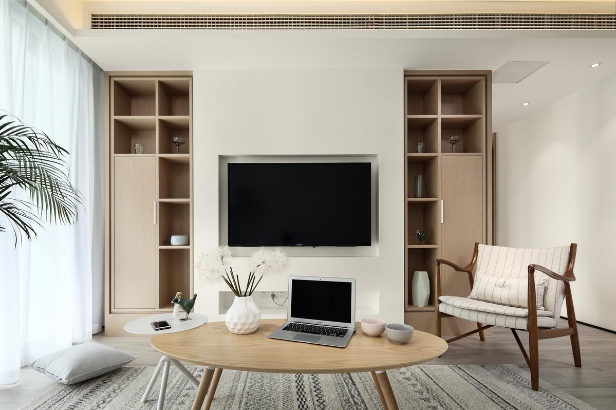 #客厅 #厅电视墙嵌入对称的收纳柜,都是工人师傅现场亲自制作而成,敞开的柜子可以放很多可供观赏的装饰品或是作为书架使用。